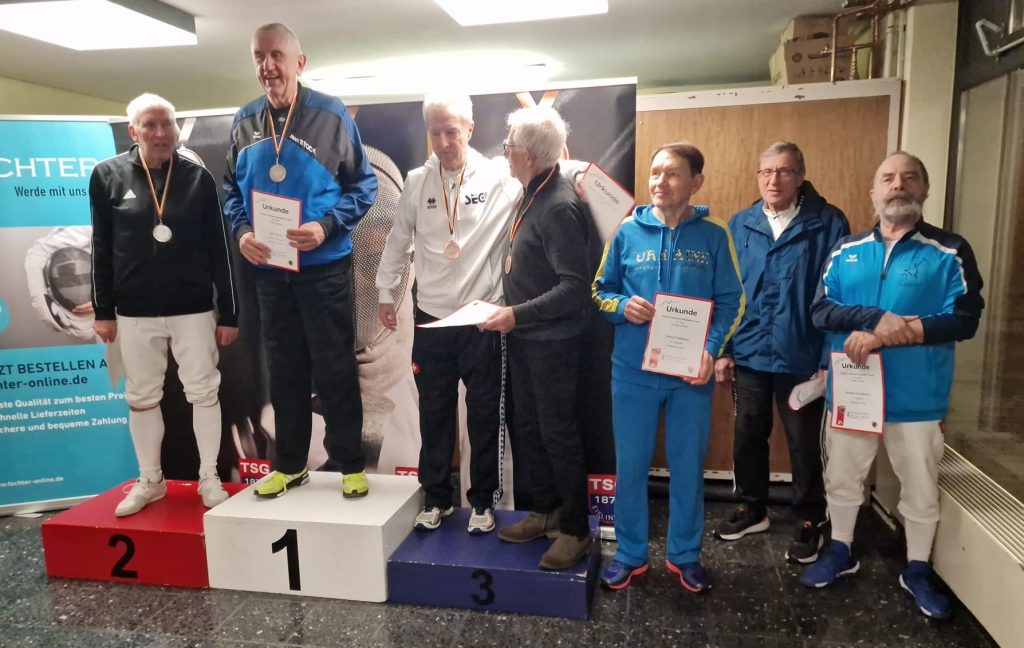 Das traditionelle Veteranenturnier in Eislingen lockte erneut Volker und Gerd auf die Planche, die beide mit Edelmetall heimkehren konnten: Im V70-Degen trafen beide leider schon früh aufeinander, nachdem Gerd eine schwere Vorrunde erwischt hatte. Volker setzte sich deutlich durch, konnte anschließend nervenstark im T8 und T4 gewinnen – jeweils in klassischer Degen-Manier mit nur einem einzigen gesetzten Treffer – und wurde erst im Finale von Langzeit-Rivale Jean Stock (BEL) aufgehalten. Herzlichen Glückwunsch zur verdienten Silbermedaille!