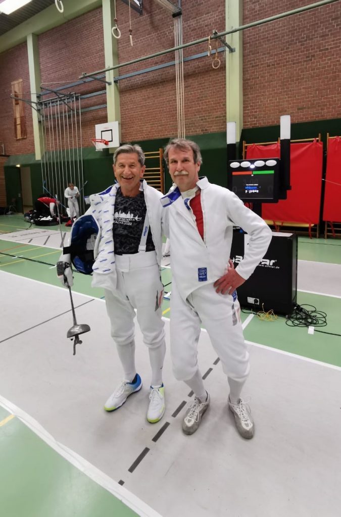 Bei der Europameisterschaft der Veteranen im französischen Thionville wurden Verein und Nation durch Gerd und Richi würdig vertreten: Gerd trat wie gewohnt in zwei Waffen an und gewann sein erstes K.O. im Florett der AK70 souverän. Das darauffolgende deutsch-deutsche Duell gegen Landsmann Berthold Schaum konnte er leider nicht für sich entscheiden und unterlag mit 3:6, damit belegte Gerd im Florett Platz 12 von 32 Startern. Im Degen lief es deutlich besser: Nervenstark entschied Gerd vier K.O.s für sich, davon drei mit nur einem Treffer Vorsprung, bis er im späteren Europameister Laszlo Imreh (HUN) seinen Meister fand. Damit belegte Gerd Platz 8 bei 83 Startern, herzlichen Glückwunsch!