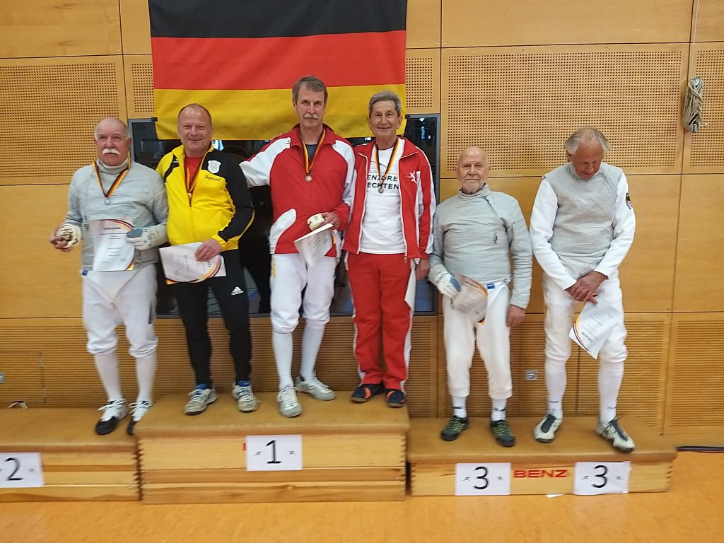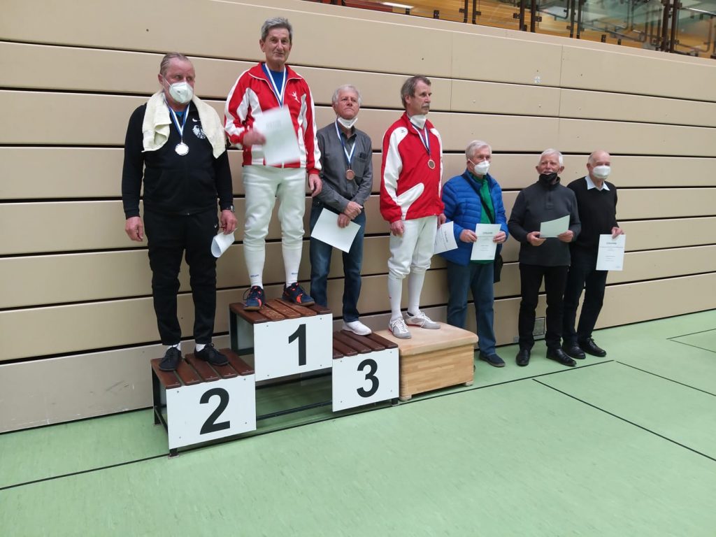 Im Herrendegen der AK 70 landete Gerd nach schwieriger Vorrunde zunächst im Mittelfeld, ließ sich davon aber nicht weiter irritieren: nach Freilos in der ersten K.O. Runde gelang anschließend die erfolgreiche Revanche gegen Hanns Prechtl und erst im Halbfinale war dann denkbar knapp mit 9:10 (nach Verlängerung) gegen den späteren Titelgewinner Norbert Kühn (SSG Bensheim) Endstation. Macht in Summe zweimal Bronze für Gerd an einem Wochenende, herzlichen Glückwunsch!