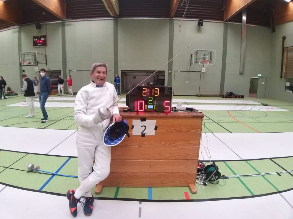 Weite Wege scheut Gerd nicht: die auch für Gäste offenen Landesmeisterschaften Sachsen-Anhalt riefen ihn in die Metropole Großkorbetha bei Merseburg, um sich gleich in zwei Waffen zu messen. Im Florett der AK70 kam er zu einem ungefährdeten Erfolg, da nach einer kombinierten Vorrunde der AKs 40, 50 und 70 der einzige Gegner in seiner Altersklasse im darauffolgenden Finalgefecht die Waffen streckte. Etwas mehr zu tun war im Degen der AK70, wo Gerd jedoch nichts anbrennen ließ und nach einer Vorrunde mit fünf Siegen ohne Niederlage direkt ein Freilos für die Direktausscheidung erhielt. Im Halbfinale ungefährdet mit 10:5 erfolgreich, setze Gerd sich auch im Finale souverän mit 10:7 gegen Gerhard Heinze (KSZU Meiningen) durch und sammelte die zweite Goldmedaille an diesem Wochenende – herzlichen Glückwunsch!