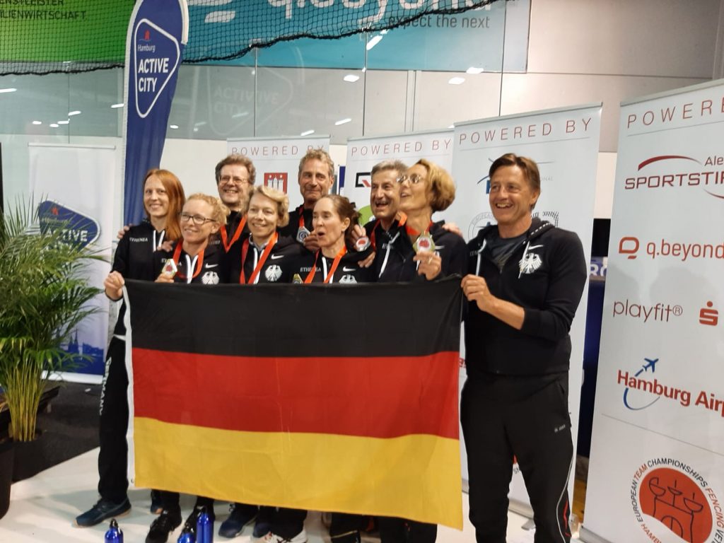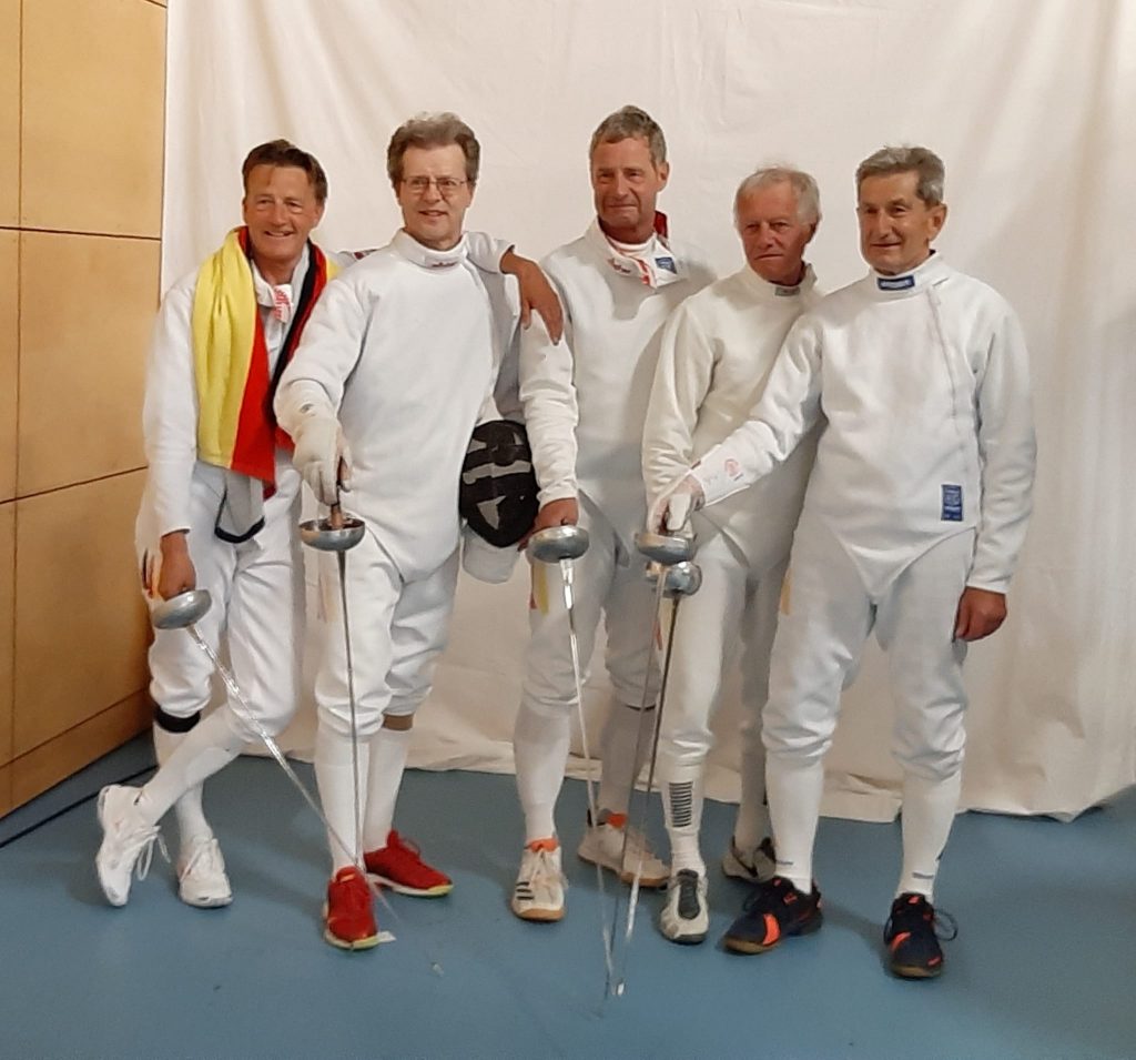 Durch seine kontinuierlichen Leistungen hatte sich Gerd wie berichtet zusammen mit Achim Bellmann, Bruno Kachur, Georg Schmidt-Thomée und Frank-Helge Gerber einen Platz in der deutschen Degennationalmannschaft der „Grand Veterans“ bei der EM in Hamburg gesichert. Nach perfekter Vorrunde auf Platz 1 gesetzt konnte sich das Team mit teils deutlichen Siegen gegen Schweden und Großbritannien ins Finale fechten. Hier war die Equipe aus Frankreich leider nicht zu schlagen, doch stand am Ende eine verdiente Silbermedaille für die deutschen Vertreter und damit herzlichen Glückwunsch an Gerd zum Titel des Vizeeuropameisters!